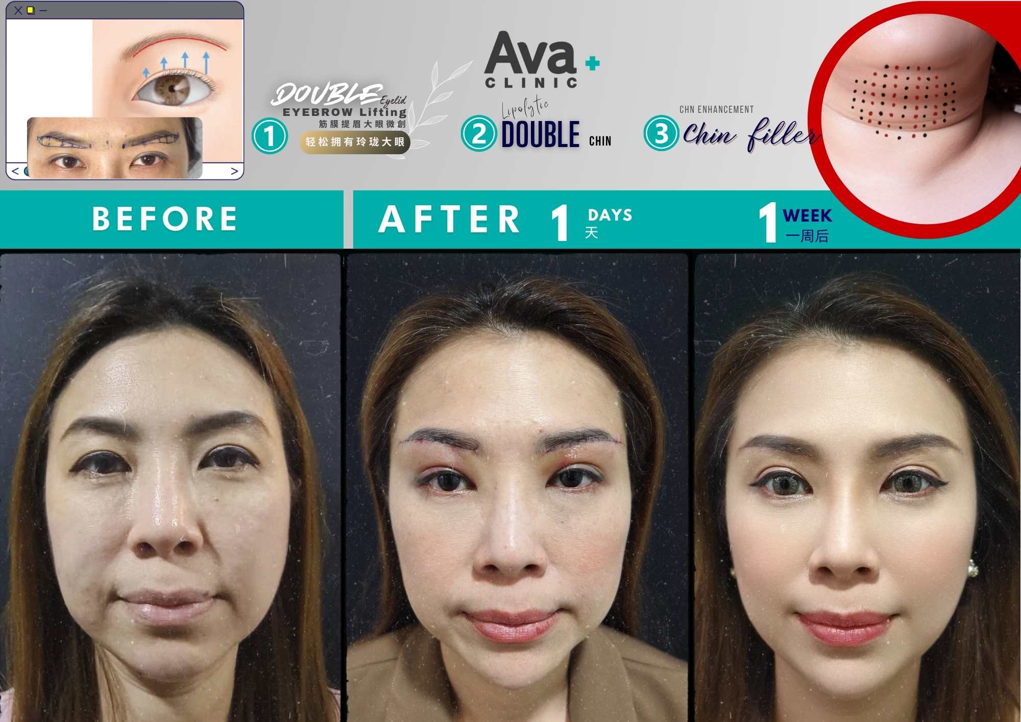 1) Double Eyelids Lifting +2)Fat Removal +3)Threads (Piccolo-i x20 (RM3,000) Double Cog x 4 (RM3,400) BFL x1 (RM1,500)